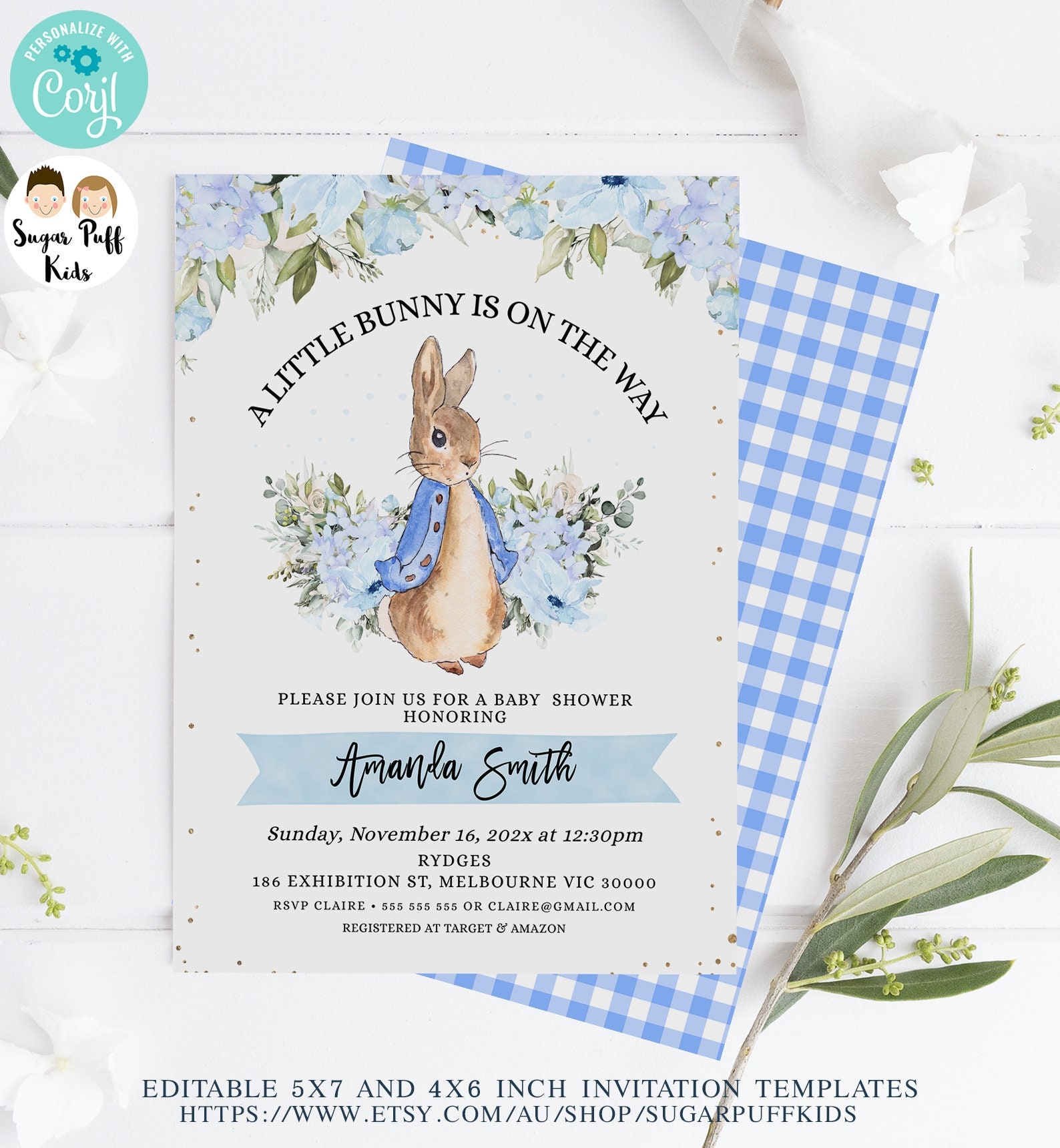 Printable Peter Rabbit Baby Shower Invite Editable Blue Floral Little Bunny Baby Shower Invite Instant Peter Rabbit Baby Shower Invite Etsy